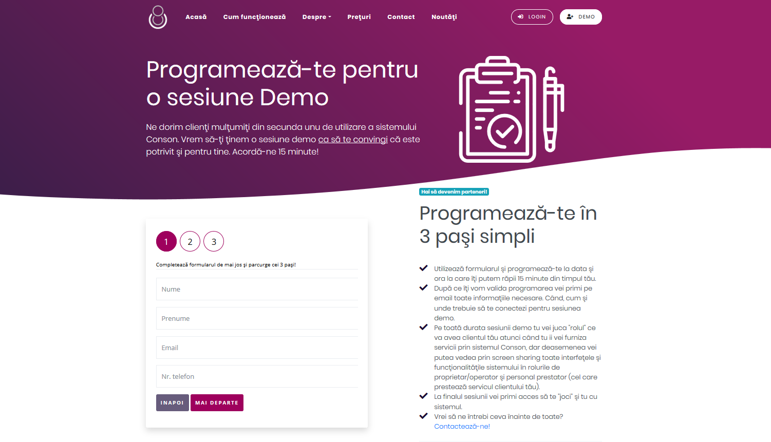 Dacă nu ai o pagină web în care să integrezi modulul de programări odată cu crearea contului Conson vei primi un Landing Page personalizat cu logo-ul tău, datele tale şi toate informaţiile necesare astfel incât clienţii tăi să poată face programări online.