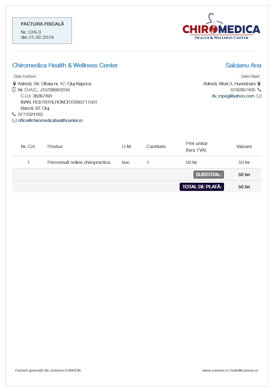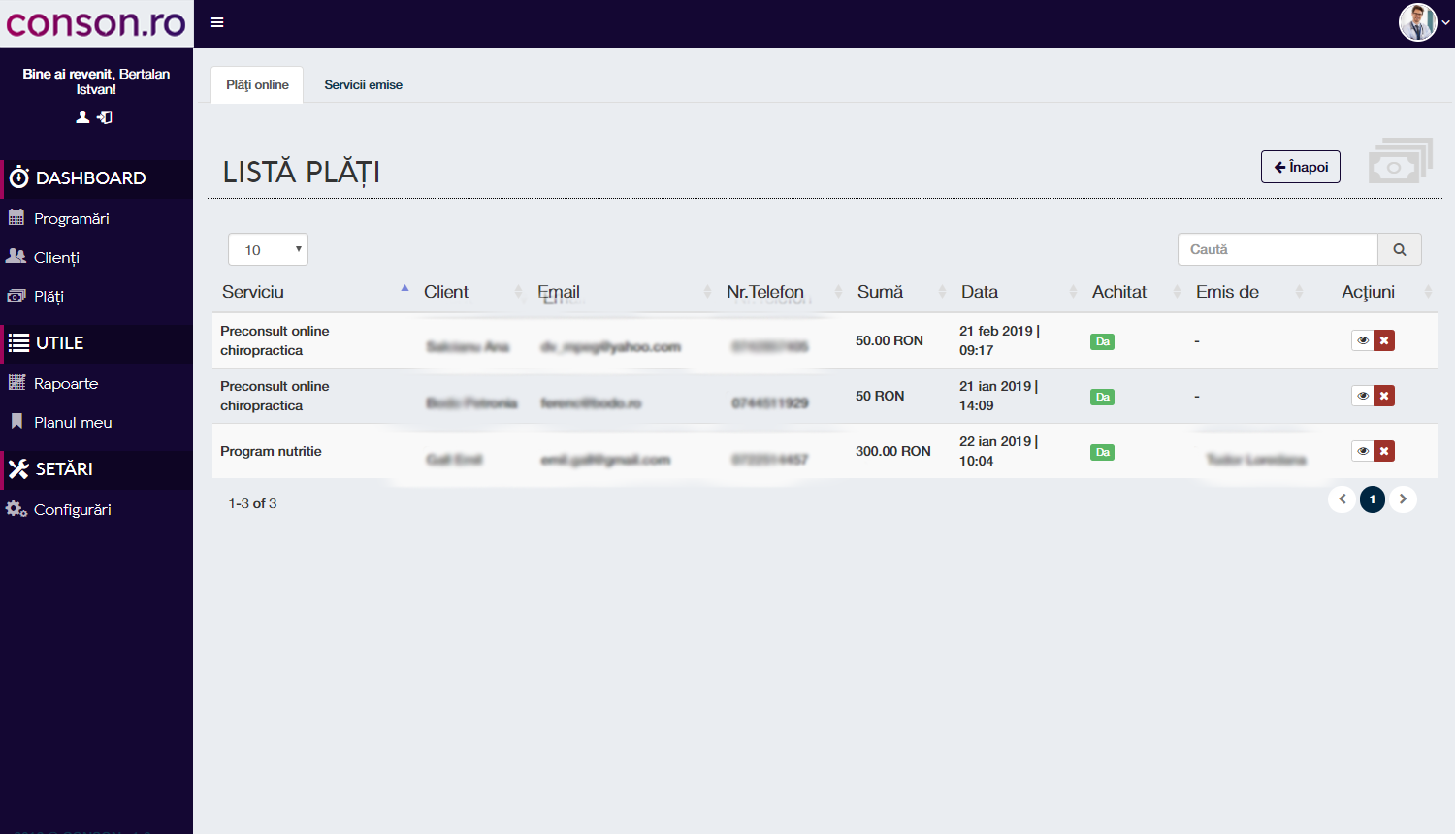 Pentru a completa ciclul de programare şi emitere serviciu pentru plată online platforma Conson îţi pune la dispoziţie modulul de facturare