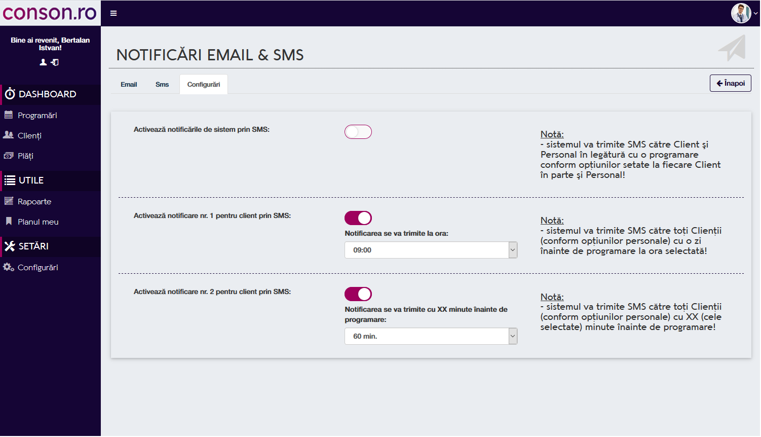 O programare neonorată de către client înseamnă pierdere, de timp şi bani! Sistemul Conson conform setărilor personalizate va notifica toţi participanţii şi anume clientul, personalul şi operatorul în diferite etape din fluxul de programare şi furnizarea efectivă a serviciului astfel incât să existe cât mai puţine anulări. Notificările pot fi atât în cadrul soft-lui cât şi pe email şi sms.