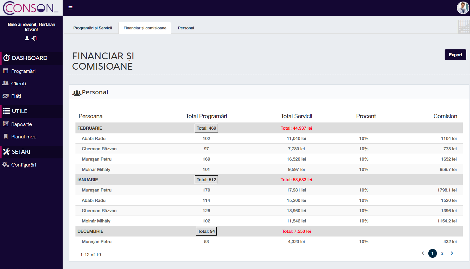 rapoarte şi statistici per locaţie, departament, personal, serviciu, etc. Deasemenea îţi calculează în mod automat comisioanele